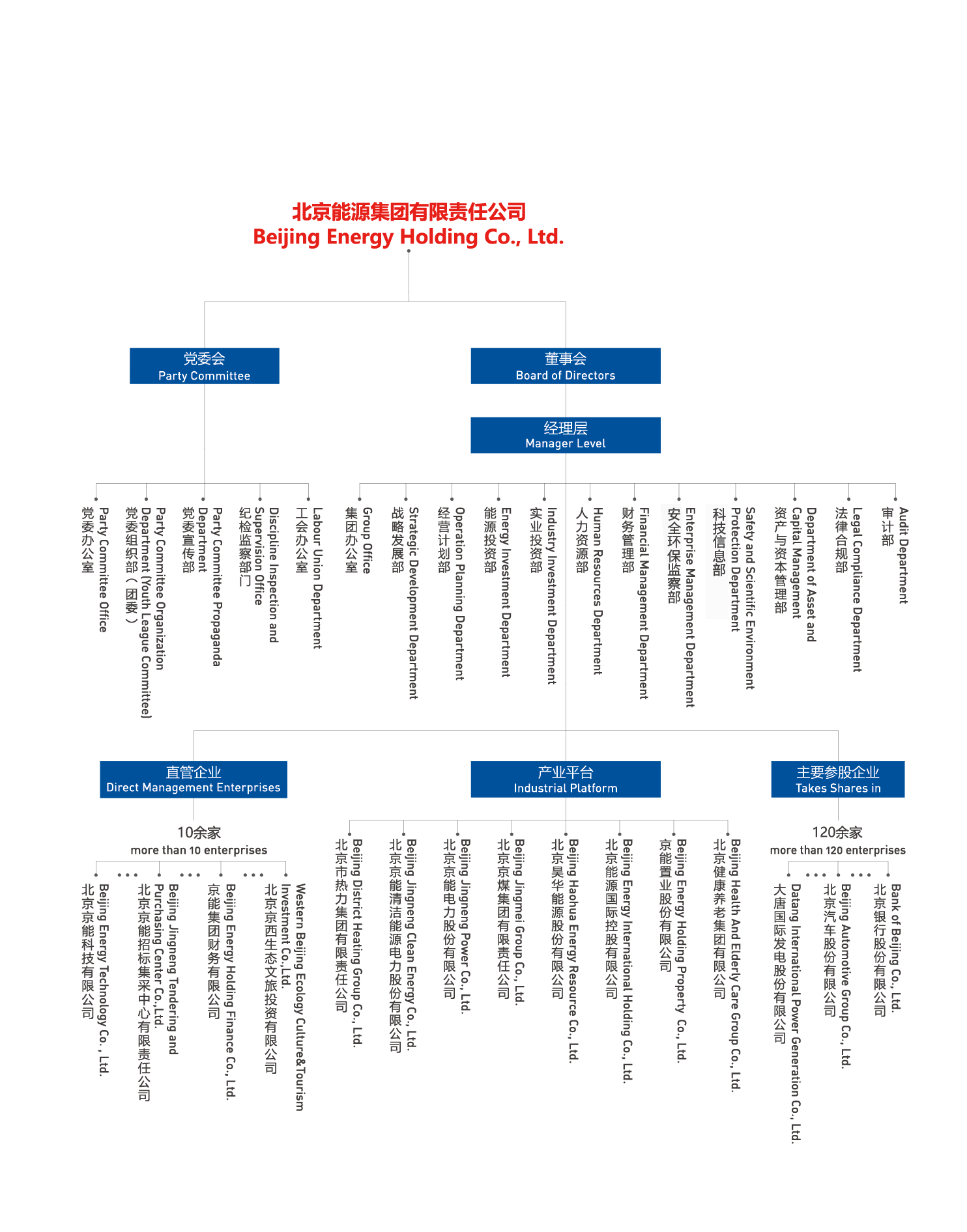 北京能源集團有限責任公司(以下簡稱“京能集團”或“集團”)是北京市人民政府出資設立的國有獨資公司,肩負著保障首都北京能源安全可靠供應的重任。集團成立于2004年,由原北京國際電力開發投資公司和原北京市綜合投資公司合并而成,2011年、2014年先后又與北京市熱力集團有限責任公司、北京京煤集團有限責任公司實施合并重組,實現了產業鏈條融合互補。經過多年的資源整合,集團由單一能源產業發展為熱力、電力、煤炭、健康文旅等多業態產業格局。2024年底,集團資產規模達4934億元,年營業收入975億元,全資及控股企業860余家,參股企業120余家,擁有員工3.4萬余人,投資區域遍布全國33個省市區以及海外,控股京能清潔能源、京能電力、昊華能源、京能置業、北京能源國際、京能熱力六家上市公司,盈利水平長期穩居北京市屬企業前列。2024年在中國企業500強排名第247位,中國服務企業500強排名第87位。
